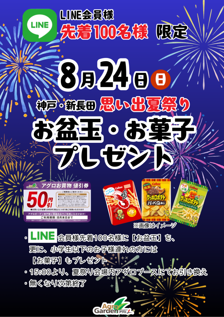 8月24日(日)神戸・新長田 思い出夏祭り当日、LINE会員様先着100名様に【お盆玉】を、更に小学生以下のお子様連れの方には【お菓子】もプレゼント。